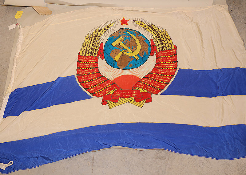 War-134 Soviet Navy Flag of the Minister of Defense. Made of rayon with two blue stripes in a good displayable size 145 x 95 cm. and marked on the hoist 'Minister of Defense' ca. 1980's.(See more images on my website www.garyhendershott.net) $150 |